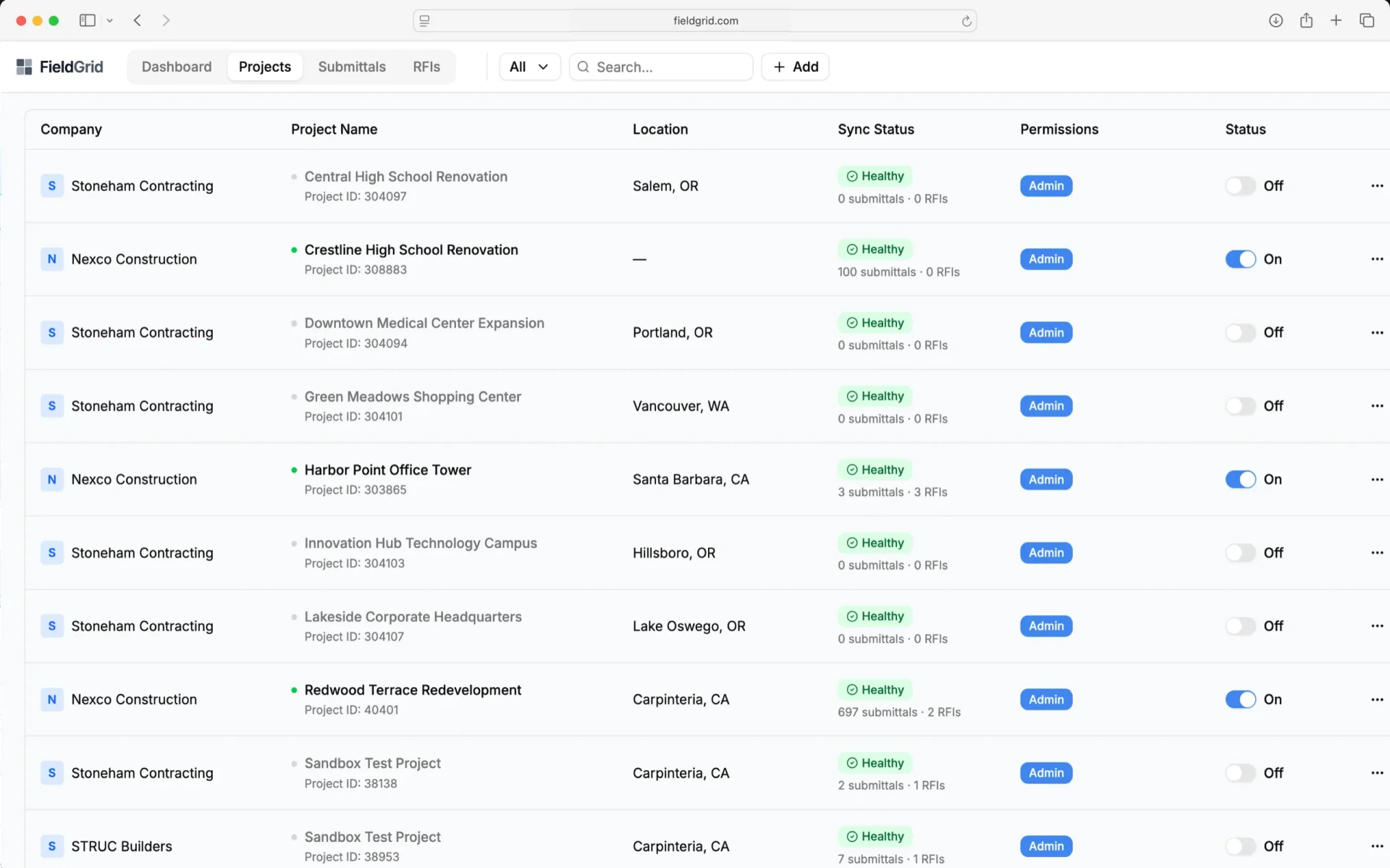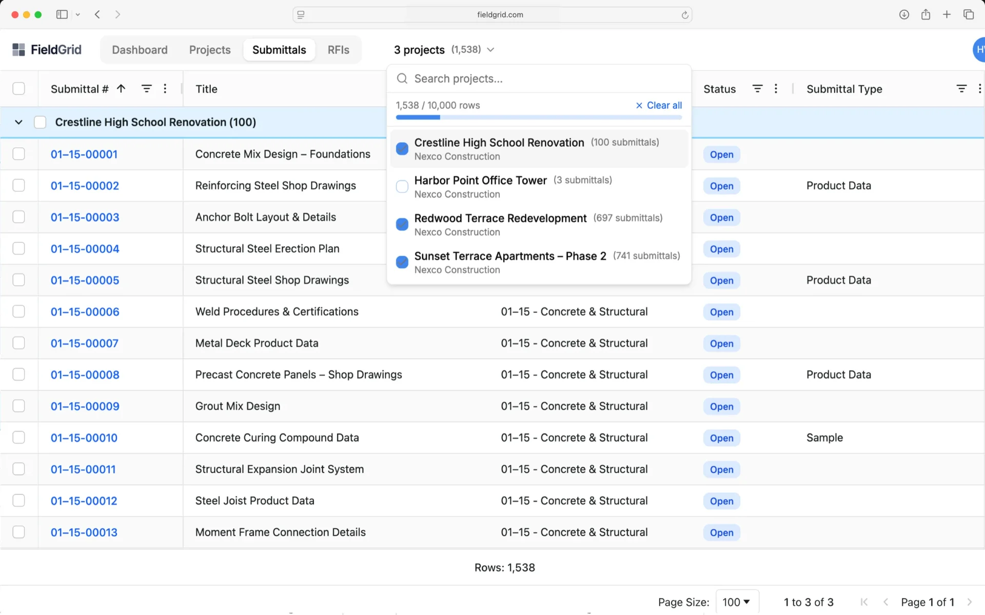 Manage submittals and RFIs across multiple companies and projects from a single unified grid. No more jumping between tabs or waiting for pages to load. See everything that matters in one place.